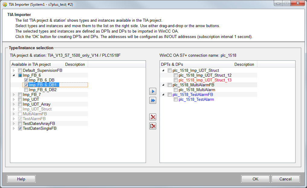 Depending on the selected mode (online or file browsing) either online data or data of the selected TIA export file is displayed. The TIA importer browses data types of the TIA project and lists FBs (function blocks) and UDTs (user defined types) together with their instance DBs (data block instances). Instances can be selected and imported to WinCC OA. On import there will be automatically created: