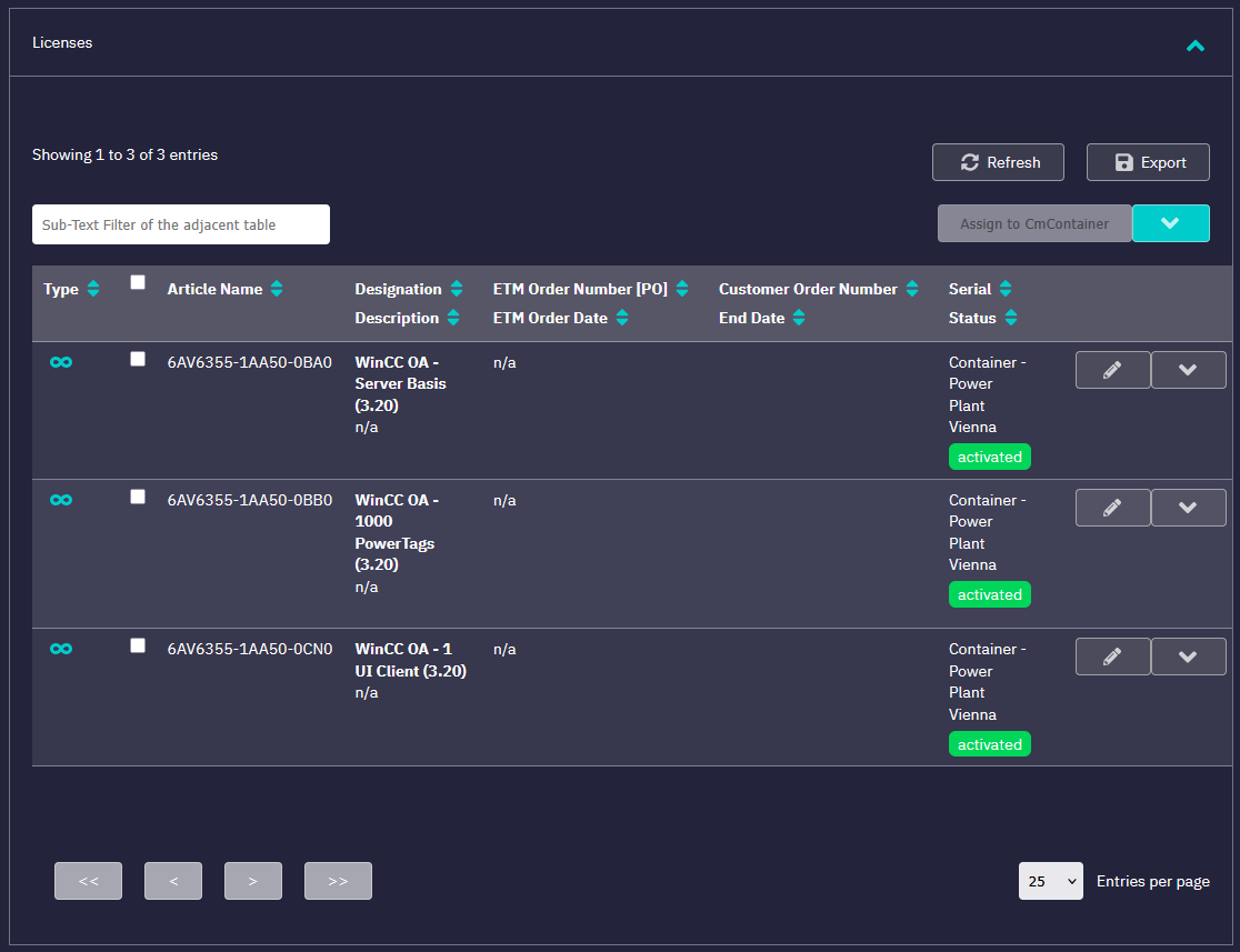 In the Licenses section, you will find the list of licenses currently associated with the project. Additional information is given, such as Article Name used for precise identification within the system, as well as its common name designation (e.g. WinCC OA – Server Basic). The container to which each license is currently bound is also displayed, along with the activation status.