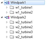 Create two views "Windpark1" and "Windpark2" in the plant model editor. The view Windpark1 contains the node "Turbine1".