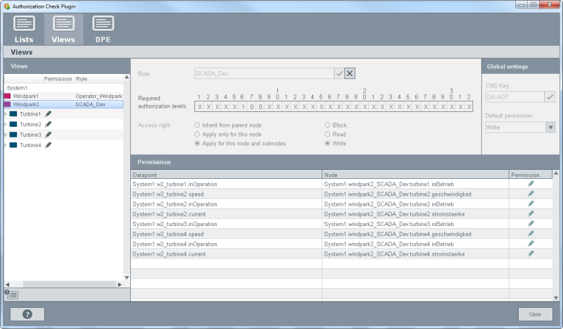 This example comprises a windpark example with two views Windpark1 and Windpark2 and four different nodes Turbine1, Turbine2, Turbine3 and Turbine4. Before working through this example, configure the project for the use of the authorization check plug-in.
