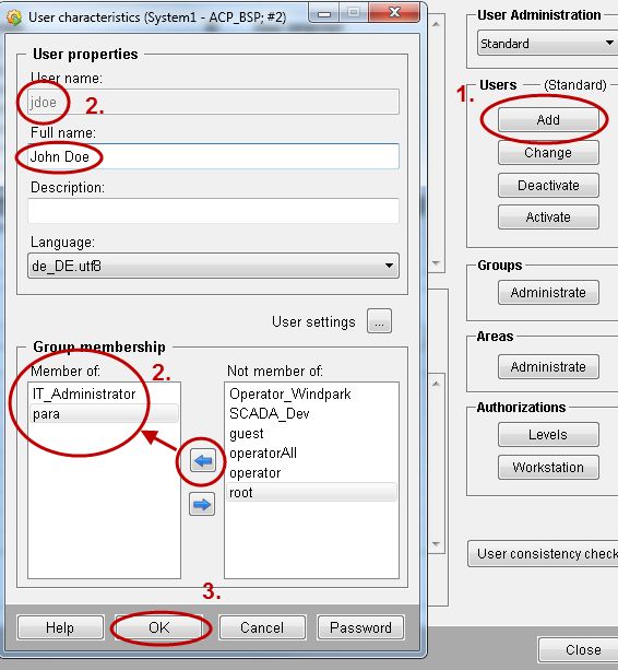 - All users belong to the group "para". Additionally the user John Doe belongs to the group "IT_Administrator" . The user Max Mustermann belongs to the group "SCADA_Dev" and jschmidt to the group "Operator_Windpark".