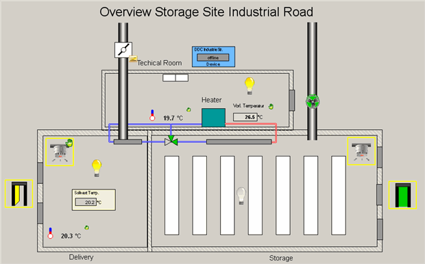 This panel shows symbols that represent fixtures (lamps, fans, thermometers, etc.) in a storage site. In reality these fixtures send information about their value/state to the BACnet device, from which the device information from Engineering Explorer is uniquely read and updated (online engineering). These symbols were already referenced as objects of the example device "DDC IndustrieStr." (Device 6789).