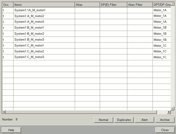 Click the "Check" button. The list must now contain 9 items: the motors in plant 1 (3 halls) see also the figure Check group further on. Note that some filter settings count datapoints twice. In order to prevent this, check the group settings as follows: