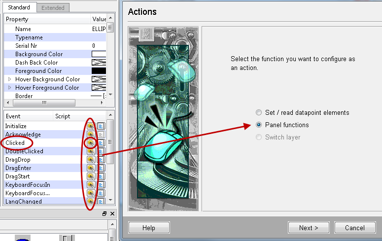 Open the "Simple Configuration" for the event "Clicked" via the Property Editor of GEDI (see figure below). Select the option "Panel functions" after opening the "Simple configuration": Figure: "Panel functions" Option