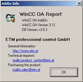 The menu option Report/Info provides information on the current version of Excel Report. It also displays links to the WinCC OA home page and ETM contact addresses.