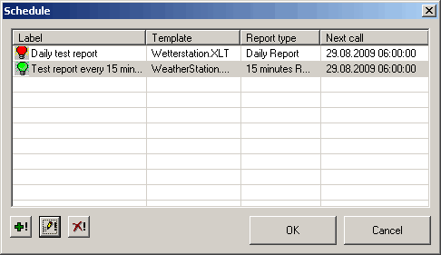 Time-tabled control can be configured through the Report/Schedule menu option. The list displays all programmed report generation actions with the time of their next execution.