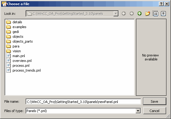 The Choose a file dialog box shows by default the \panels directory of the current project. You can create and open other sub-directories. In the figure above you can see the panels directory of the project.