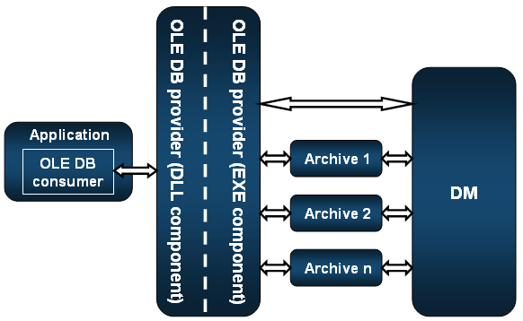 The provider EXE component is integrated into this version as a WinCC OA manager (WCCOAoledb). Communication with the individual archives is through TCP/IP. The provider DLL component supplies the queried data to the consumer (program that can be used to access data in WinCC OA using OLE DB):
