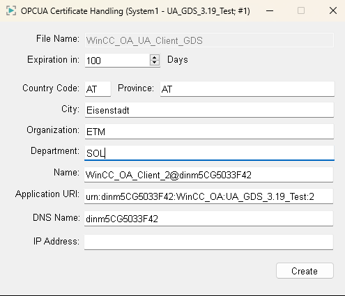 The certificate creation panel is already filled with the default Name, Application URI, and DNS Name used by the driver when communicating with the GDS. All other fields must be filled manually.