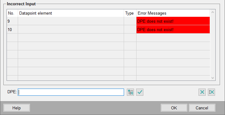 This panel displays the index number of the DPE, the actual name of the datapoint element, the data type and the error message.