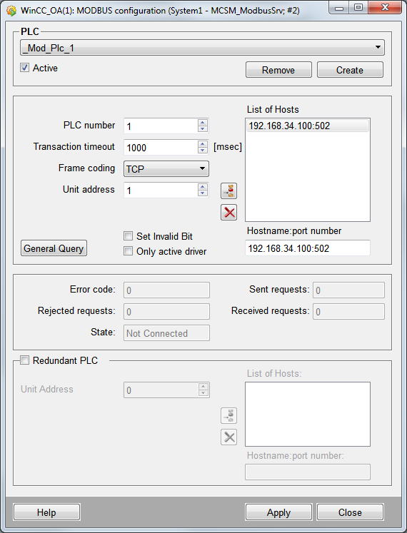 Add a WCCOAmod manager to the console and configure the driver accordingly (see Configuration of the Modbus/TCP driver). Define the hostname or the IP address of your server including the port (in this example 192.168.34:502). Note that the unit address must match the node ID of RTU 1 (=1).