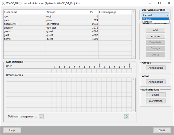 If you change from WinCC OA user administration to OS Auth. user administration, all WinCC OA users are deleted and the Windows or Linux users as well as the Windows/Linux user groups the users belong to, are adopted at the first login! The authorizations for the user groups , however, have to be defined in WinCC OA.