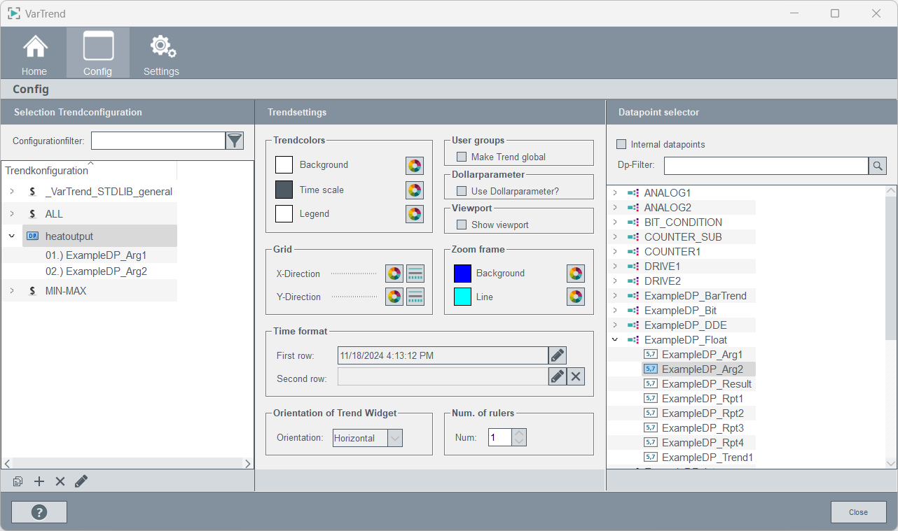If a trend configuration is selected, the parameters of that configuration are displayed. In addition, a datapoint selector is also shown. This allows you to add curves to the current trend configuration by drag and drop. The individual sections of the Trend Settings are described below.