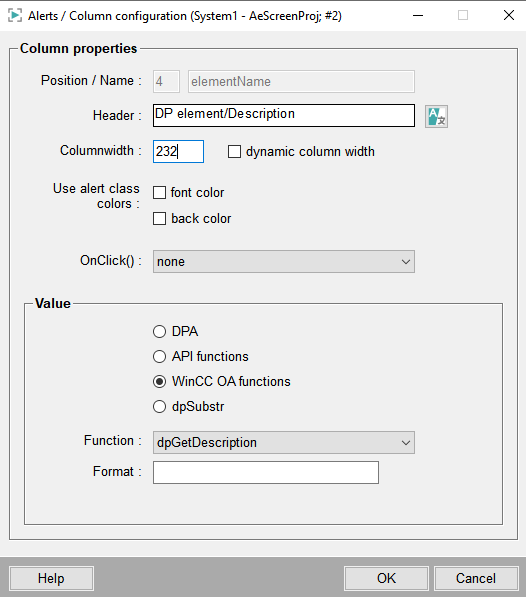 - WinCC OA functions: Choose a predefined function from the combo box. The function specifies the content of the column. The functions are not CONTROL functions but have a similar description. This makes it easier to understand the function. You can also specify a format here.