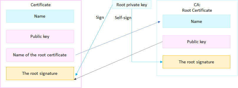 The root signature: CA verifies the identity of the person who requests to create a certificate and the information and then creates a certificate and signs it.