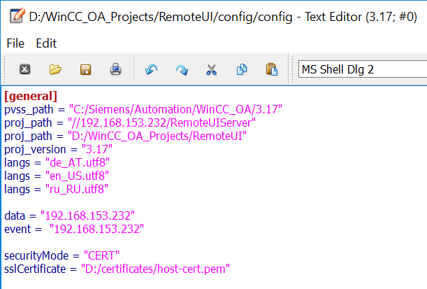 Defines the security mode (CERT, WINCERT). See the description of the config entry. If security mode WINCERT is configured, the config entry winCert determines which certificate from the Windows Certificate Store is used for SSL/TLS communication. If security mode WINCERT is configured, the config entry winRootCA determines which certificate from the Windows Certificate Store to be used for certificate verification during SSL/TLS session negotiation. Please see the description of the SecurityMode entry. The mxProxy specifies the WinCC OA server host as well as the MXProxy host. |