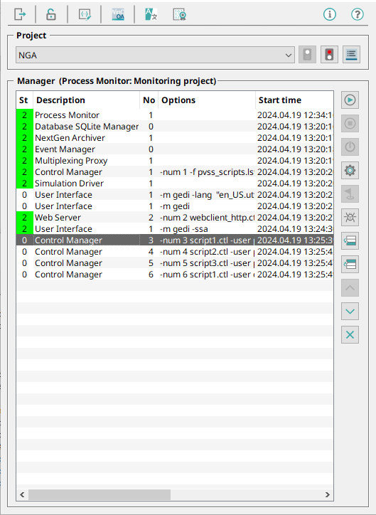 void main() { DebugTN("The script 1 is running"); } - In the console, add 5 CTRL managers and one UI manager to the console with the following manager options: