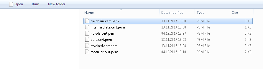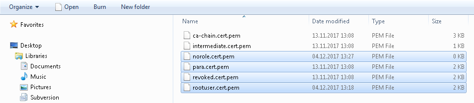 Figure 2. norole.cert.pem, para.cert.pem, revoked.cert.pem as well as rootuser.cert.pem file