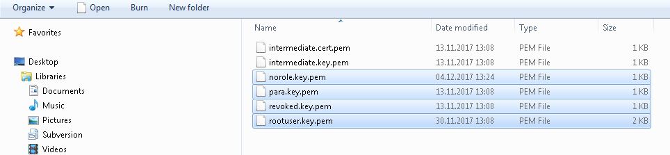 Note:Keys must only exist on a computer where a manager uses the keys to authenticate. On the server (if the server only starts its managers as the user root), only one rootuser.key.pem is required. The other keys are only needed on the clients connecting to the server. To authenticate these clients, the server only needs the chain file.Figure 4. norole.key.pem, para.key.pem, revoked.key.pem, rootuser.key.pem