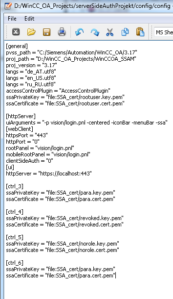 [general] ssaPrivateKey = "file:SSA_cert/rootuser.key.pem" ssaCertificate = "file:SSA_cert/rootuser.cert.pem" The following settings for the UI manager: [httpServer] uiArguments = "-p vision/login.pnl -centered -iconBar -menuBar -ssa" The following settings for different Control managers: [ctrl_3] ssaPrivateKey = "file:SSA_cert/para.key.pem" ssaCertificate = "file:SSA_cert/para.cert.pem" [ctrl_4] ssaPrivateKey = "file:SSA_cert/revoked.key.pem" ssaCertificate = "file:SSA_cert/revoked.cert.pem" [ctrl_5] ssaPrivateKey = "file:SSA_cert/norole.key.pem" ssaCertificate = "file:SSA_cert/norole.cert.pem" [ctrl_6] ssaPrivateKey = "file:SSA_cert/para.key.pem" ssaCertificate = "file:SSA_cert/para.cert.pem"Figure 5. Config file with Config entries