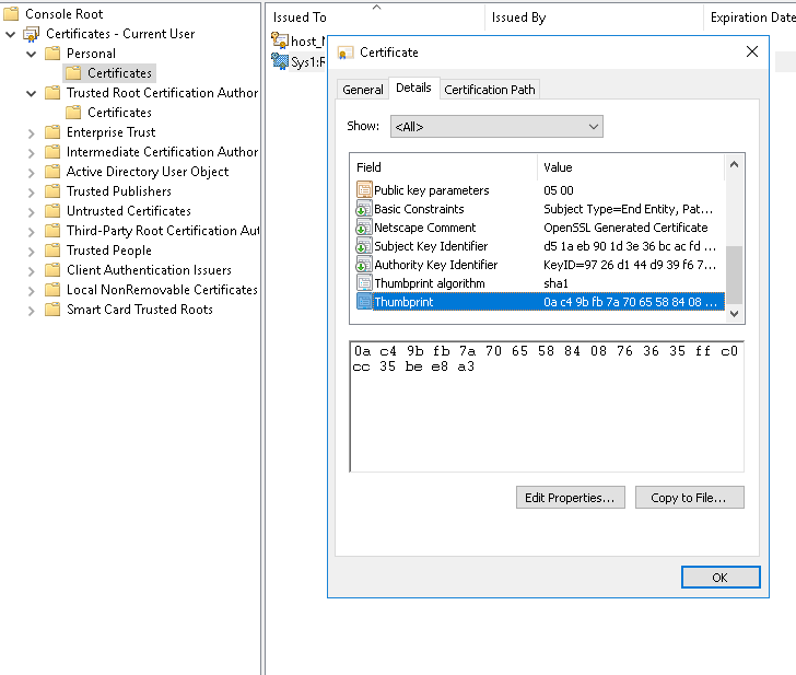 Figure 1. Windows Certificate Store - Thumbprint of an imported MxProxy Certificate