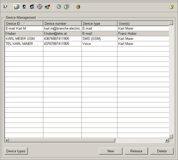 In this panel you can see a panel with the configured devices. The devices can be created using the New button. Normally, the available devices are created when defining users (see also Create users and assign devices). Devices that you define using this panel are mostly devices that can be assigned to several users, this means so called "Pool devices". With the button Release a device selected from the table can be shared again. This means that the affected device is deleted at all users to whom it was assigned and is not available anymore (for example, if a device is broken, it can be set inactive temporarily via click on this button). If the device is shared and should be used for one or several users again, the device has to be added for the user manually. Before you, however, define different devices, the device types have to be created.