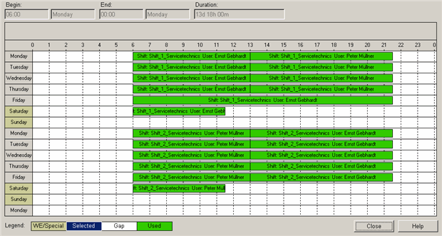 In this overview you can see that the main shift (composed of two single shifts) has a periodic sequence of 2 weeks and on Sunday there is a gap in the configuration (in the panel for the configuration of a shift sequence there also is a reference to the gap - in the overview you can easily see where this gap is). The shifts can be changed at all times and the changes are automatically applied to the shift sequence. (see also Define shifts).