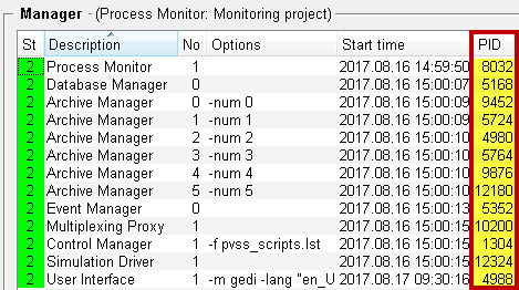 The function pmonGetPID() returns the process ID of a WinCC OA manager. A manager is started in the WinCC OA console and the PID is shown in the console - see figure below.