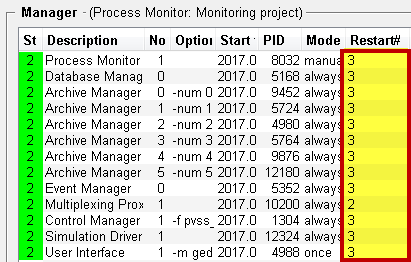 main(mapping event) { string pName; int i, reCount; for (int i = 0; i < pmonGetCount(); i++) { reCount = pmonGetRestartCount(i); pName = pmonGetName(i); DebugN("Manager name: ", pName, "Restart count:", reCount); } }