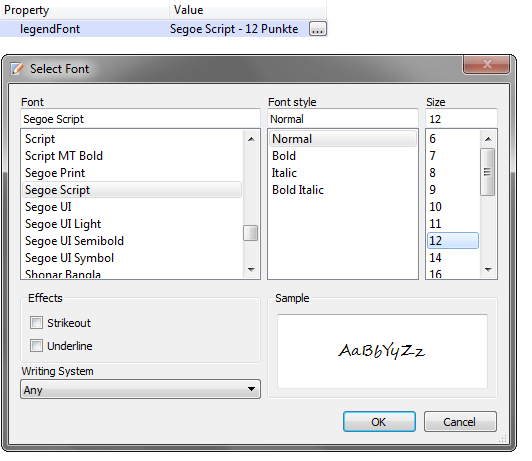 In the following example, the font of the legend was set to "Segoe Script" in the size 12.