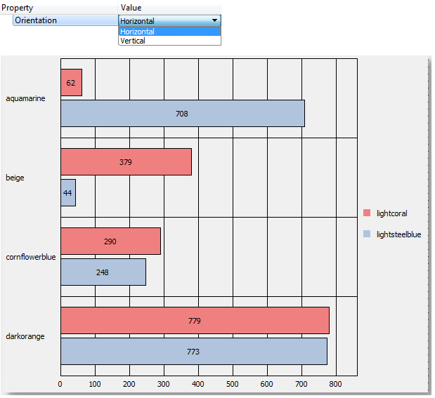 Defines the orientation of the shown bars in the charttypes Bars, StackedBars and PercentStackedBars. "Vertical" creates a vertical orientation of the bars, "Horizontal" a horizontal orientation.