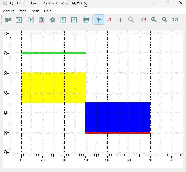 This attribute is used to specify the data for the "Bar" display mode. The width of the bar on the X-axis is defined by the parameter "x1" (start coordinate) and "x2" (end coordinate). The y dimension for this particular bar is set by the reference value (see "refValue") and the value in array "y1". In addition, a horizontal line is drawn at the position specified in the array "y2" (for example, set value). The color for the bars can be defined in the "color1" array, the color for the line in the "color2" array.