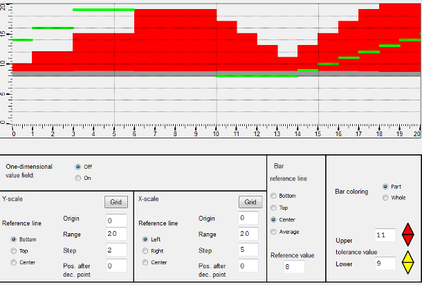 This attribute can be used to specify the reference value for the bars. The reference value defines the Y value from which the bars will be drawn, the root of the bars so to speak. The tolerance limits set with "tolHigh"; and "tolLow"; are based on this value (as a percentage).