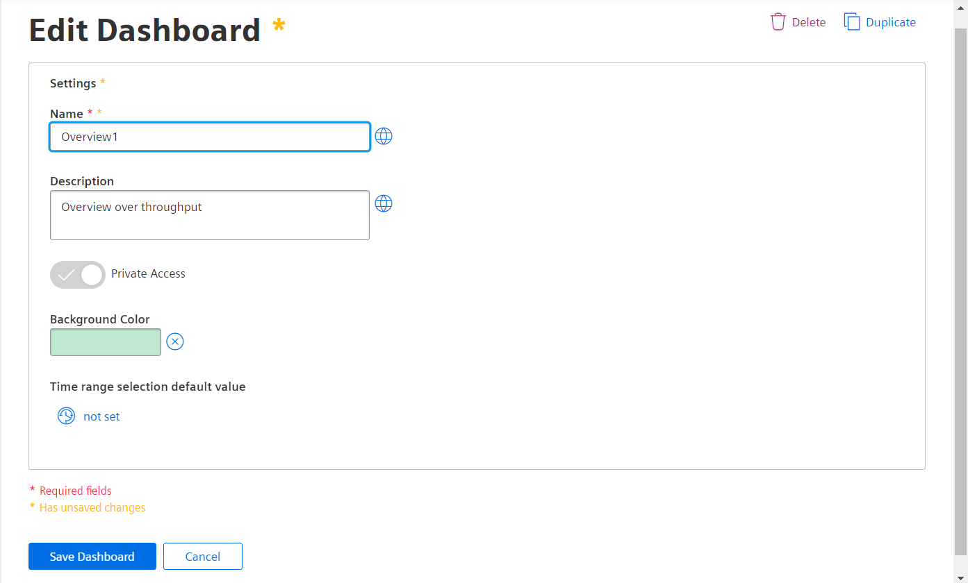 The Dashboard Settings will open automatically upon adding a new dashboard. Here the user can edit the title and description in all available project languages. One of the buttons to the right is used to delete the board, while the other button places a duplicate in the overview. Via the slider, the dashboard can be set to private view, making it only visible to the user who created it. The background color for the dashboard is set with a color-selector. The "Time range selection default value" lets you choose a value to be set as default for time ranges within the dashboard.