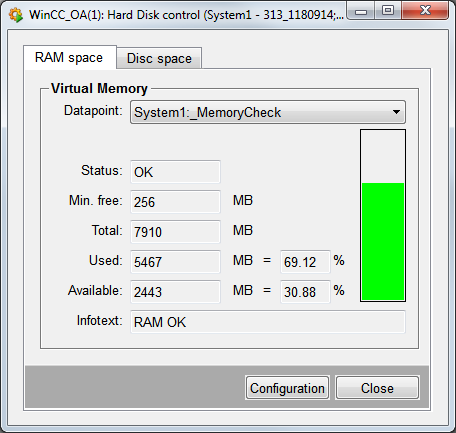 The datapoint for monitoring the memory can be selected from this combo box. By default, _MemoryCheck and _MemoryCheck_2 (for redundant systems) are listed in the combo box.