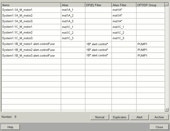Clicking on the button Alert changes the display of the panel and shows what element in the system has a configured active alert handling. In the left bottom corner of this panel you can see the number of configured alerts with respect to the total number of elements in the group (in the figure below Number: 2/9 whereby the first number indicates the number of elements having an active alert handling and the second number specifying the total number of elements configured in this datapoint group).