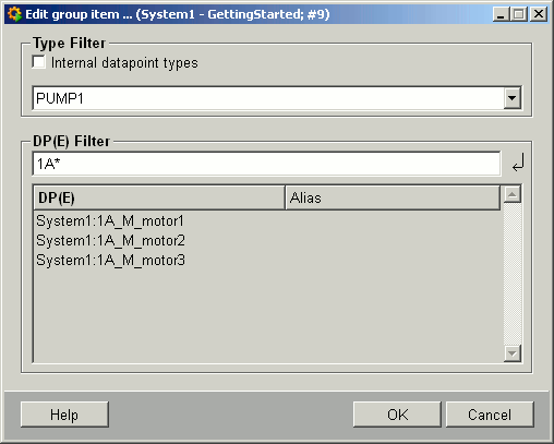 In order to try out the different filtering options, sample datapoint types were used for the following examples: Motors and Valves of DPTs PUMP1 and SLIDE_VALVE1.