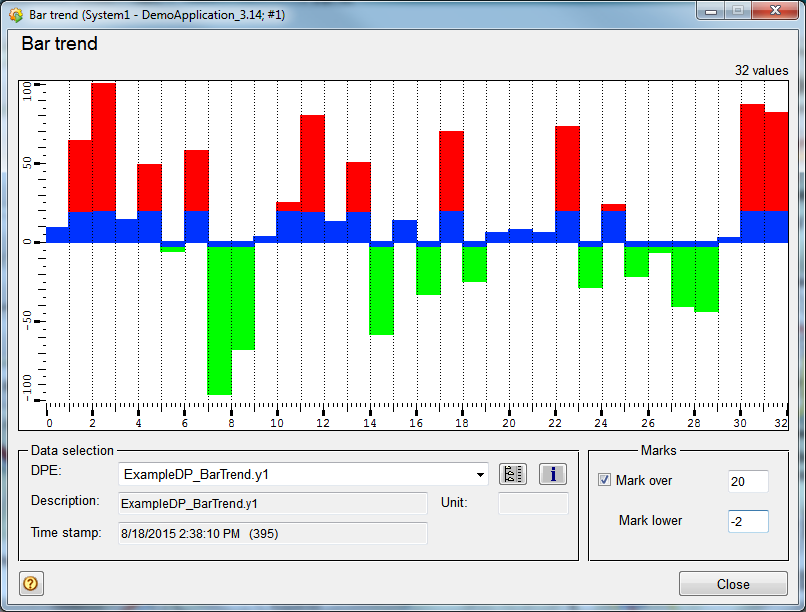 These datapoint elements contain the values of the bar trend as one-dimensional arrays. In the diagram, the array index for the value is displayed along the horizontal axis and the value itself is represented by the bar height. All values originate from the same datapoint element with the same time stamps, so normally there is no temporal relationship.