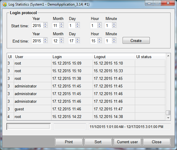 Call up a record of all logged-in users from the Start cascade. Enter start and end times. Clicking the "Login list" button displays a list of all users that have been logged in at any of the user workstations during the specified period.