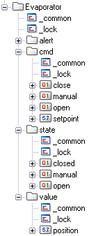 The command to open a valve is represented by the datapoint element .cmd.open. As soon as the valve is fully open, the limit switch is actuated and sends a corresponding response back to the process control system. This operational state can be read from the element .state.open. This operational state will be used for status display in a process display panel.