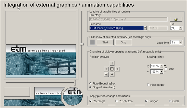 All graphics files in a directory (or by type default a subset of it) can be shown in this demonstration panel as an image set. Moreover, it is possible to change the scaling, size adjustment and position of the rectangle in the left half of the panel dynamically during runtime.