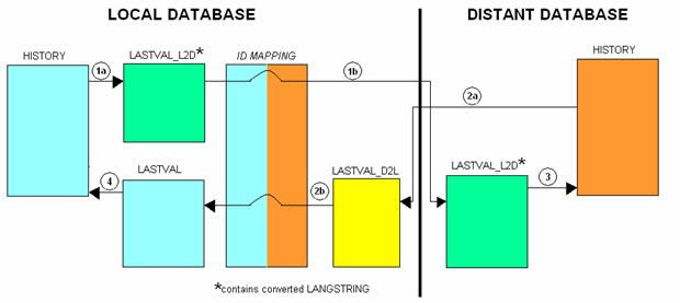 From the remote database, the values are simply copied to a local last value table, the ID is mapped, and then the entry is made to the history table. In this case there is no LANGSTRING transformation, because the transfer and ID assignment cannot be done in one step.