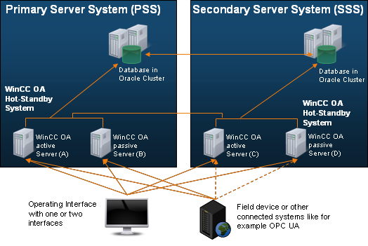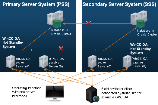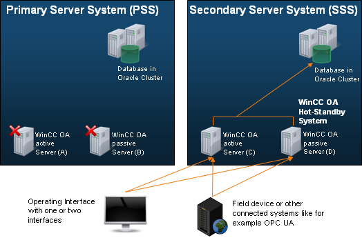 - A WinCC OA user interface that supports the connection to the PSS is started or a WinCC OA user interface is started that supports the connection to the SSS. The decision is made by the user after the connection to the active system is lost. The user makes the decision after losing connection to the active system. The user receives a notification when the other system becomes passive again and the user interface must then be opened with the connection to the other system.