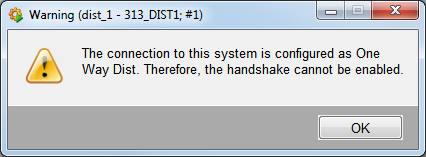 If there is a One Way Dist connection between master and client (the client cannot see the master), the handshake is automatically disabled for this client. Therefore, no confirmation is necessary for this synchronization and the synchronization result panel is displayed on the client. The handshake cannot be enabled for this client. If you click on the handshake checkbox the following warning is displayed: