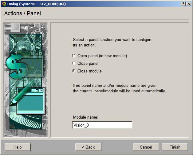 Open your panel and click on the configured object. The specified panel will be closed. Close moduleThis option closes an open module. If no module name has been specified, the command will be applied to the own module. Figure: Close module window