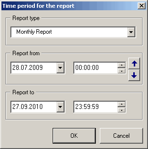 The Reports/New menu option opens a File Browser listing the templates available. After selecting a template, a window opens in which you can select the time period and the type of the report. The last full time range to have elapsed is suggested by default for each report type. This time period can customized, however, using the date and time selection box.