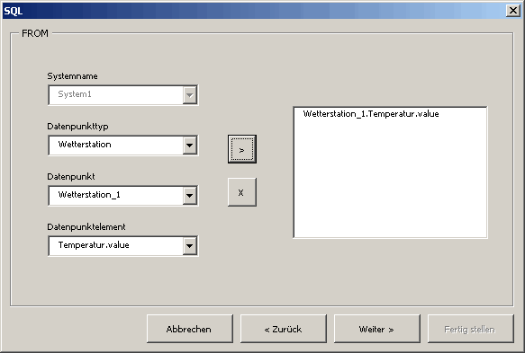 The SQL Wizard should not be used for queries of datapoints of a distributed system. It applies only these from the local system. Datapoints of a distributed system cannot be added to the list of the selected datapoints.