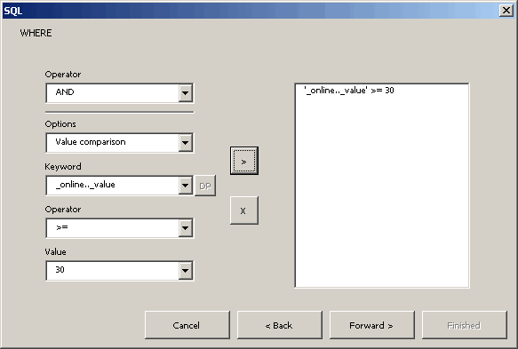 Select Value comparison from the combo box and further options as in the figure and click ">" to apply the option, then on Forward.