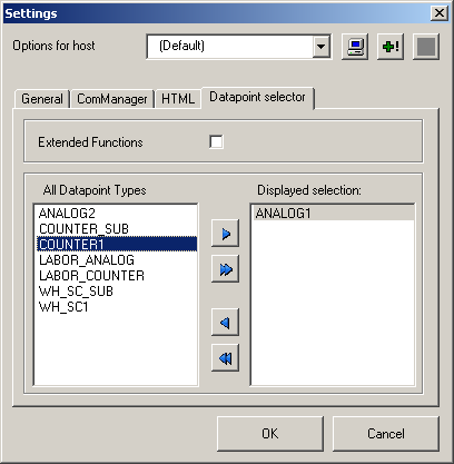 With the checkbox "Extended functions" you can specify to which extend functions should be available for inserting datapoints into a template (menu optionTemplate/Insert DP,for further informationsee also Adding a datapoint).