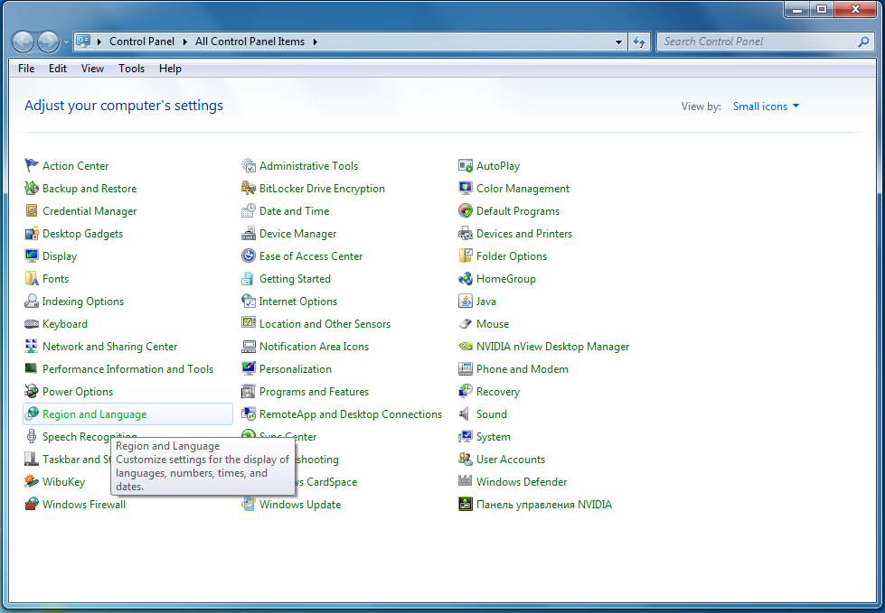 In order to change the language for the menu items, you have to change the language of the operating system. Open the Control Panel and select the option Region and Language.
